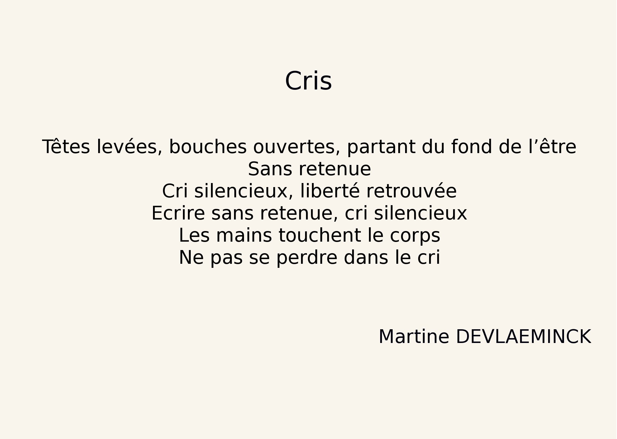 Têtes levées, bouches ouvertes, partant du fond de l’être. Sans retenue. Cri silencieux, liberté retrouvée. Ecrire sans retenue… SUITE