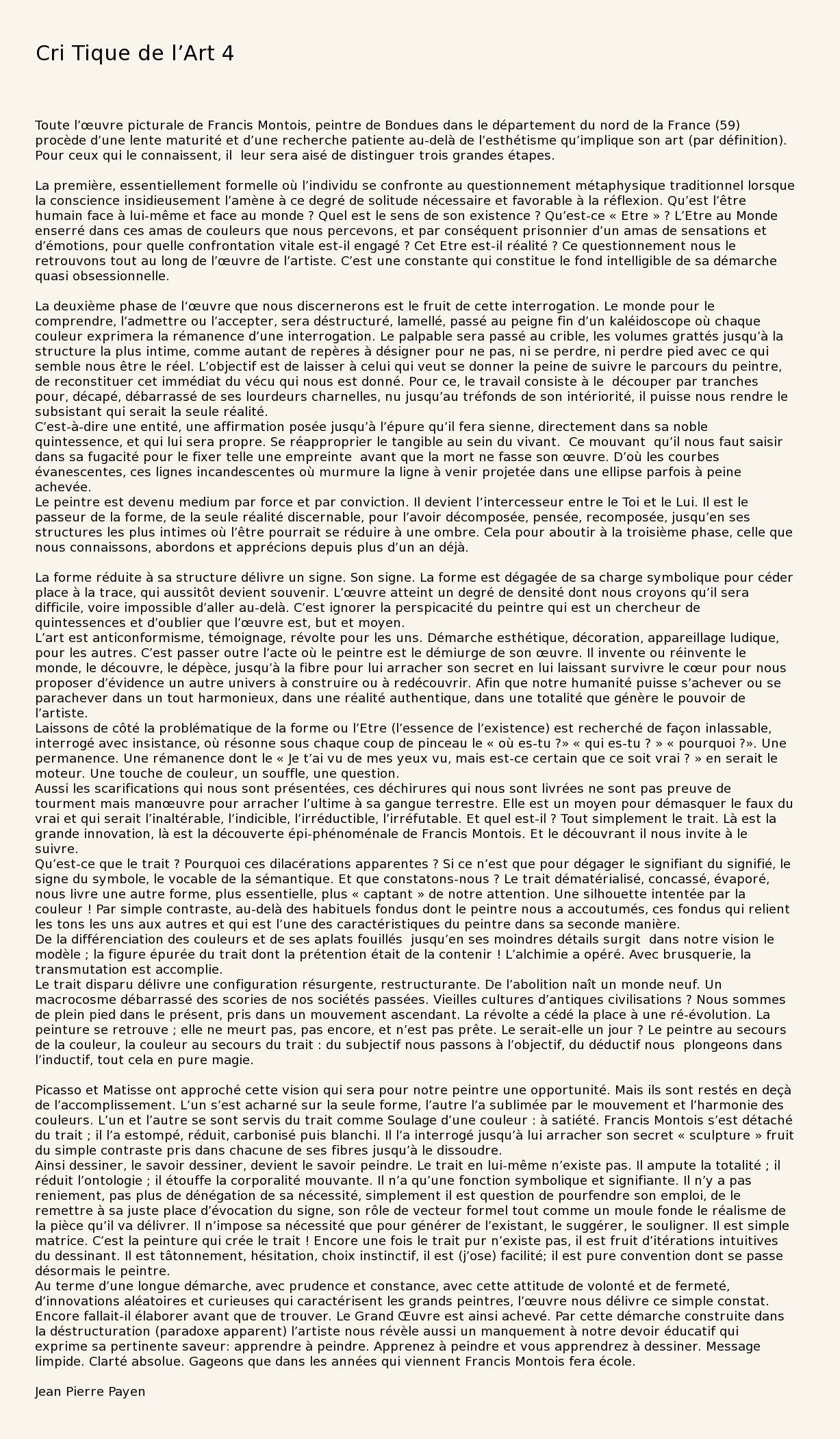 Cri Tique de l’Art 4 / Jean-Pierre Payen. Toute l’oeuvre picturale de Francis Montois, peintre de Bondues dans le département du nord de la France (59) procède d’une lente maturité et d’une recherche patiente au-delà de l’esthétisme qu’implique son art (par définition). Pour ceux qui le connaissent, il leur sera aisé de distinguer trois grandes étapes. La première, essentiellement formelle ou…SUITE